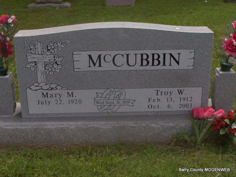 SSW: Troy - Inscription: "Married Sept. 16, 1939" - Research Note: She was a daughter of the late Ami and Georgia (Marshall) Reynaud. Mary and Troy Winfred McCubbin were united in marriage on September 16, 1939 in Monett, MO and he preceded her in death on October 06, 2003. Mary was preceded in death by one daughter, Linda Kay McCubbin; two brothers, Doran Reynaud and Carl Reynaud; four sisters, Maxine Tucker, Madeline Lasley, Glorine Howerton and Shirley Hanlon. | Photo Jay Trace Buchanan Funeral Home Phyllis Long |
