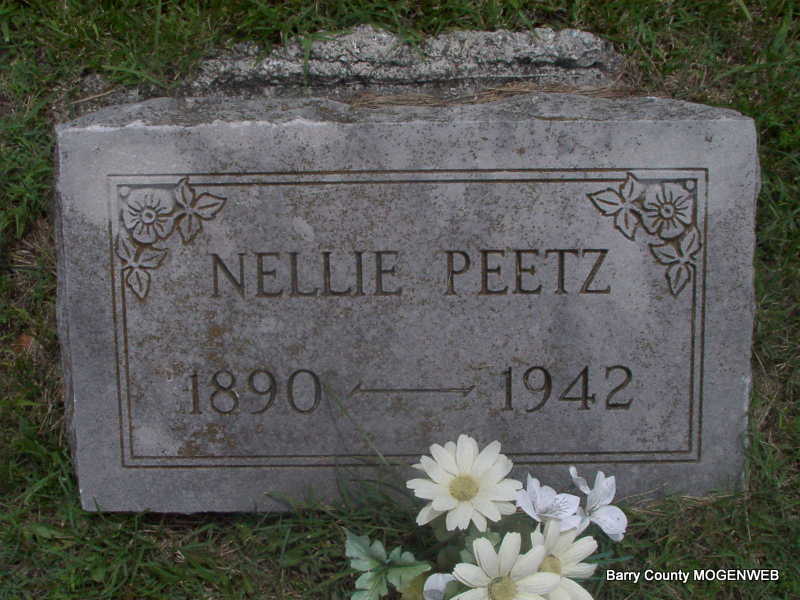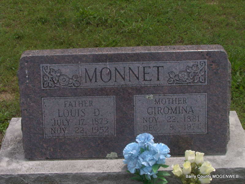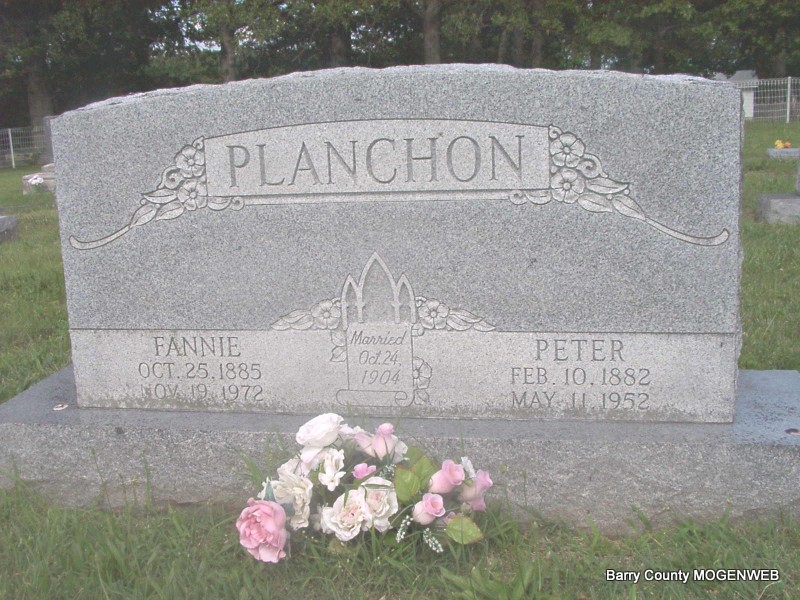 | PLANCHON, Fannie (BOUVIER) | Oct. 25, 1885 | Nov. 19, 1972 | SSW: Peter - Inscription: "Married Oct. 24, 1904" - Research Note: Daughter of Jean/John B. Bouvier and Madeline Long. Peter Planchon, age 22, married Fannie Bouvier, age 19, on Oct. 24, 1904 in Monett, Barry Co., MO. | MO Marriage Records Phyllis Long Photo Jay Trace |
