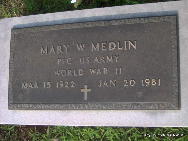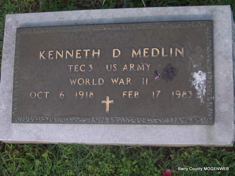 | MEDLIN, Kenneth D. | Oct. 6, 1918 | Feb. 7, 1983 | Inscription: "TECH 3 US ARMY - WORLD WAR II" - Research Note: Son of Delmar W. and Mable (Combs) Medlin. Kenneth Medlin, age 33, married Mary Hurd, age 29, on Jan. 5, 1952 in Benton Co., AR. | Sister's Obit Census AR Marriage Index Phyllis Long Photo Jay Trace |