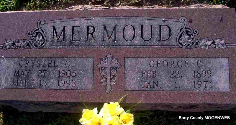 SSW: Crystel C. - Research Note: Son of Jules Francis Mermoud and Edith Arnaud. His wife was Crystal Fleetwood and she was the informant on the death certificate. - Cassville Republican, Thursday, Dec. 5, 1918 - Geo. Mermoud is home on a short furlough from Columbia to visit his father who expects to sail for Europe probably this week. - Cassville Republican, Thursday, June 12, 1919 - Hon. J. F. Mermoud and son, George, of Monett were in Cassville Tuesday. - Cassville Republican, Thursday, Dec. 18, 1919 - George Mermoud of Monett, who has been attending school at the University of Missouri is at home for the Christmas holidays. | Online Newspapers Census Death Certificate Phyllis Long Photo Jay Trace |