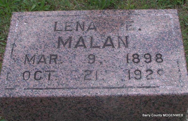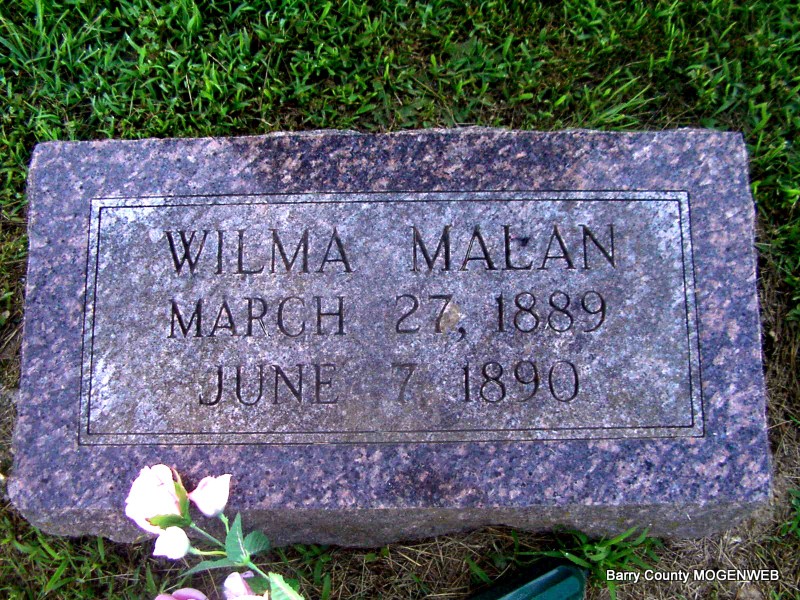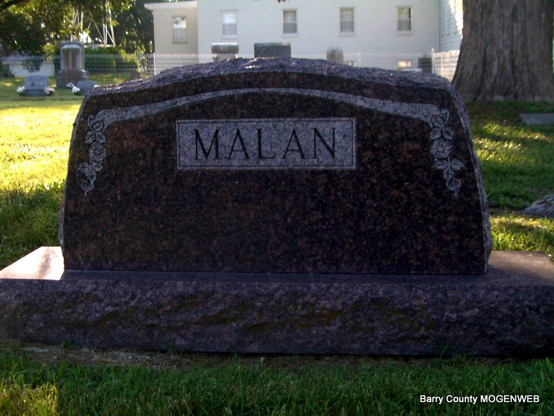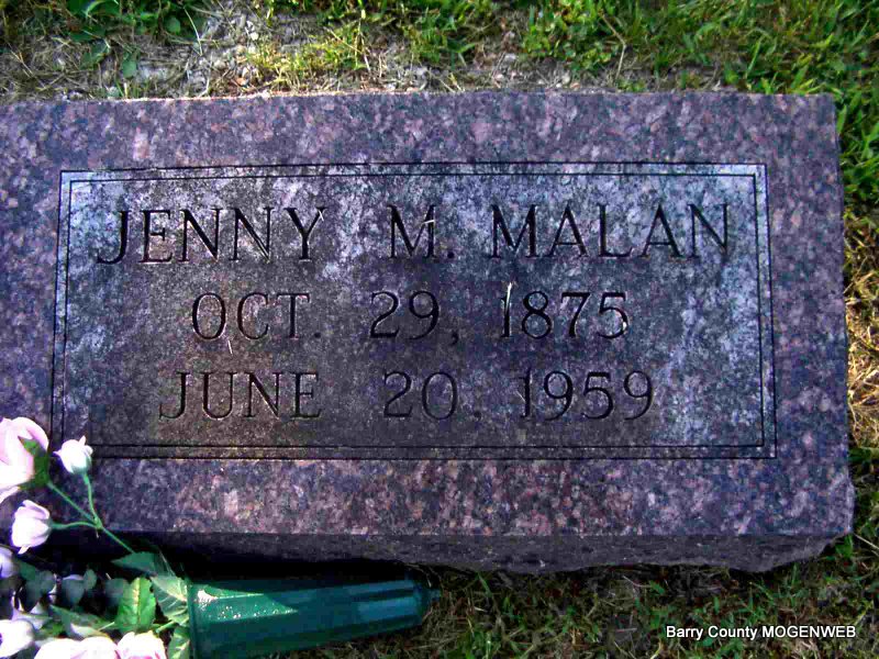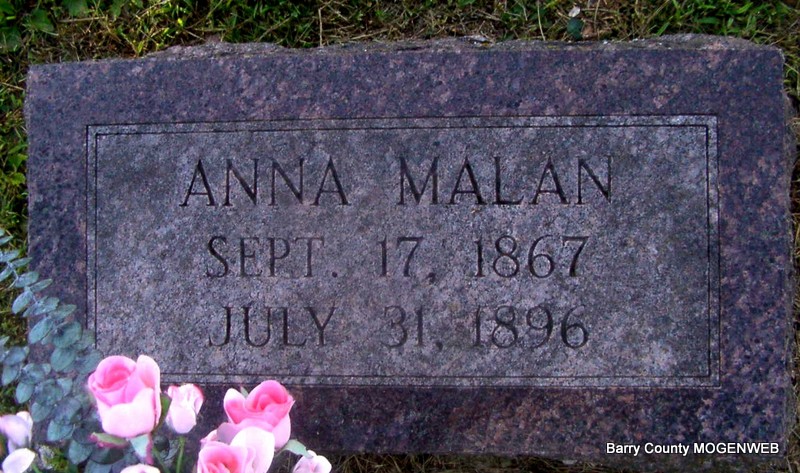 July 31, 1896 | Research Note: Daughter of Jean/John Pierre Planchon and Catherine Courdin. Annie Planchon married Henry David Malan on June 9, 1888 in Barry Co., MO. - Headstone | Census MO Marriage Records Phyllis Long Photo Jay Trace |