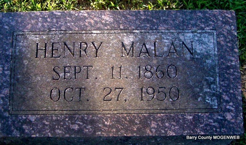 Research Note: Son of James Malan and Madeline Malan. Henry Malan married Annie Planchon on Jan. 9, 1888 in Barry Co., MO. His second wife was Emma Julia Jabas, married on Apr. 3, 1897 in Monett, Barry Co., MO, and she is buried in Waldensian Cemetery under Jabas, not Malan. They were divorced. Her death certificate is under Malan. His wife on his death certificate was Jennie Malan and she was the informant. - Henri Malan's first wife was Anna Planchon. Their children born at Monett were Dahlia, Elva (Avondet), Grace (Cuendet), William, who married Naomi Bounous, daughter of Alexander and Marie Lautaret Bounous. Anna Malan died and he then married Miss Jabas. They were the parents of twin daughters, Lena Malan and Laura Malan Rausch. After the second Mrs. Malan's death, he married Jennie Marguerite Avondet. - Headstone | Death Certificate MO Marriage Records Phyllis Long Waldensians of Barry Co. Photo Jay Trace |