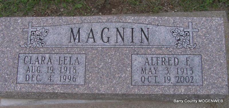 SSW: Clara Lela - Research Note: Son of Felix and Julie (Cuendet) Magnin, married Clara Lela Terry on May 30, 1976, in Monett, and she preceded him in death Dec. 4, 1996. He was preceded in death by one sister, Eugenie Rutledge. | Monett Times Oct. 21, 2002 Mary Homesley Photo Jay Trace |