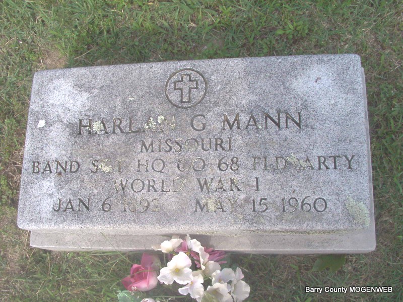 Inscription: "MISSOURI BAND SGT HQ CO 68 FLD ATRY WORLD WAR I" - Research Note: Stone reads that the year of birth was 1892, obit reads 1893, death certificate has 1892 . Enlisted on Dec. 4, 1914 and released on Dec. 12, 1918. Married Marguerite Planchon on June 11, 1945 in Bentonville, AR. - Son of Robert Mann and Stella Craig. His wife was Marguerite and she was the informant on the death certificate. | Death Certificate Headstone Applications Phyllis Long Monett Times Photo Note Jay Trace |