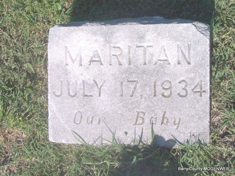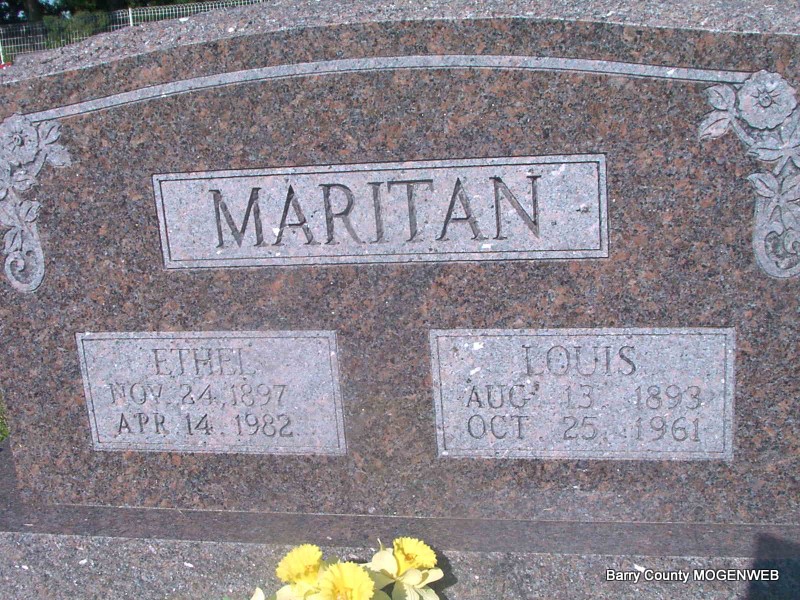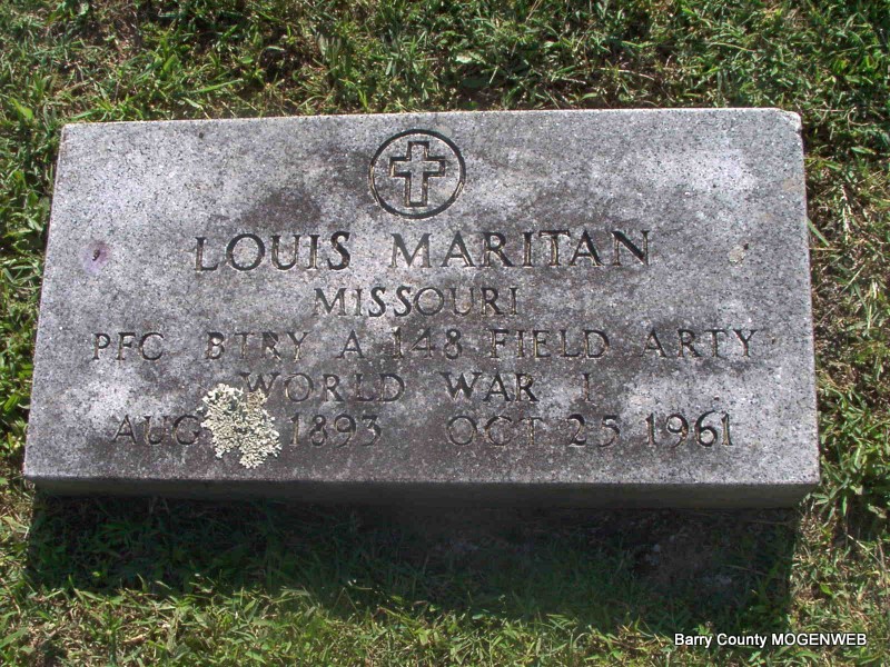 SSW: Ethel - Research Note: Father and mother listed as unknown. Cause of death, corona thrombosis. Retired railroad clerk, World War I veteran. Wife listed as Ethel Maritan, who was also the informant. - Louis Maritan moved from the Piedmont Valley, Italy, to New York in 1909 and to Monett in 1910 where he lived with the Bertalot and Balmas families. He married the former Ethel Lee in Monett and served three years in World War I. His three sons, Joe, Harold, and Gene, all served in World War II. Son of Joseph Maritan and Teresa Avaro. - Military Stone - Inscription: "MISSOURI PFC BTRY A 148 FIELD ARTY - WORLD WAR II" | SS Claims Index Phyllis Long Death Certificate Waldensians of Barry Co. Photo Jay Trace |