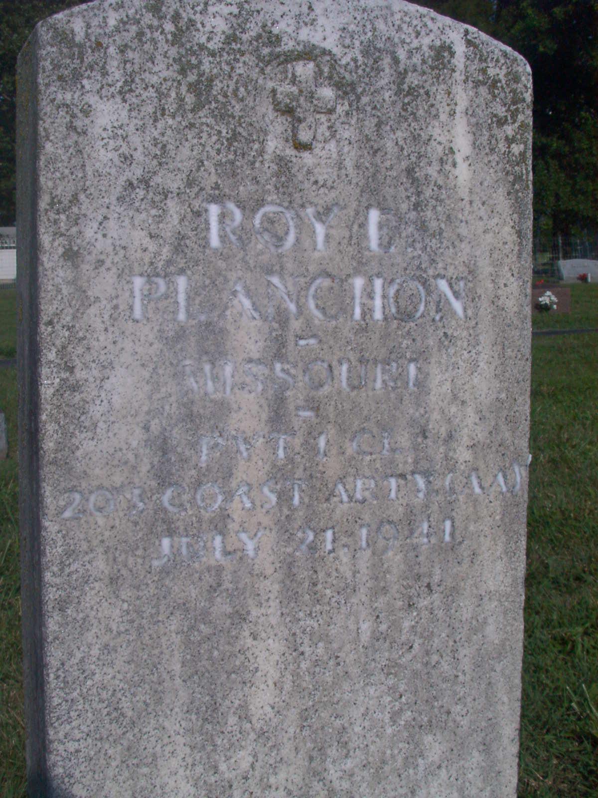 Inscription: "MISSOURI PVT 20 COAST ATRY" - Research Note: He died in Palacios, Matagorda, TX while serving in the Coast Artillery Corps during WW II. He contracted a form of Encephalitis he was son of Peter and Fannie (Bouvier) Planchon. Lawrence J. Planchon of Corpus Christi, TX was the informant. | TX Death Certificate Chuck Ayers Photo Jay Trace |