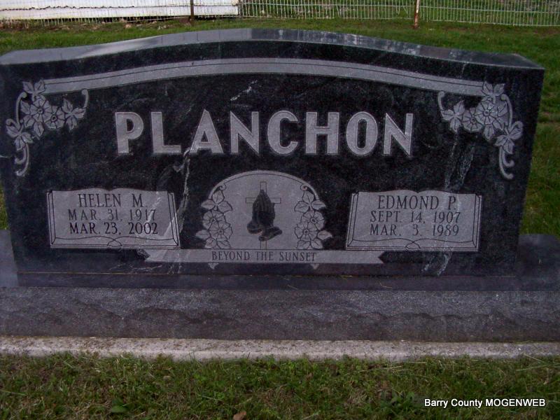 | PLANCHON, Edmond Peter | Sept. 14, 1907 | Mar. 3, 1989 | SSW: Helen M. - Research Note: Son of Peter Planchon and Fannie Bouvier. Edmond P. Planchon, age 30, married Helen Mae Gwaltney, age 20, on Nov. 19, 1937 in Cassville, Barry Co., MO. | Census MO Marriage Records Phyllis Long Photo Jay Trace |