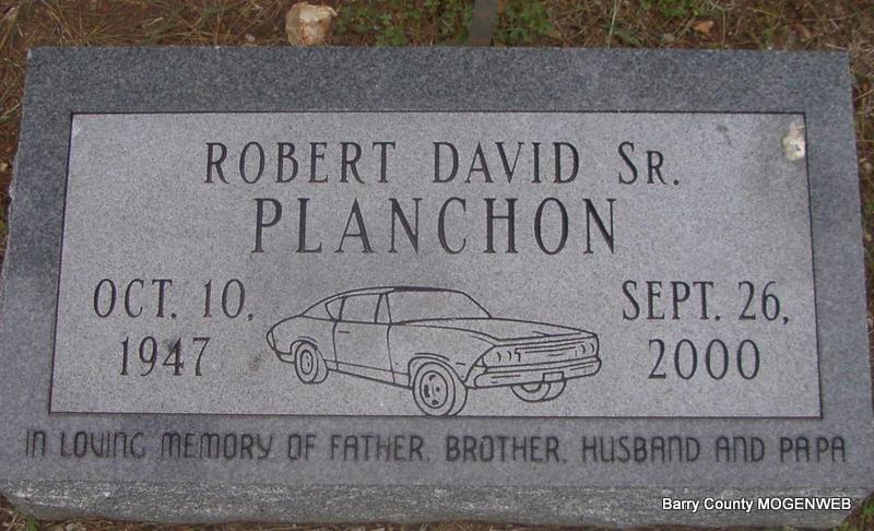 Inscription: "In Loving Memory of Father, Brother, Husband and Papa" - Research Note: Robert David Planchon, 52, of Monett, died at 7:05 p.m. yesterday, September 26, at Cox Monett Hospital. The death is under investigation by Barry County Coroner Skip White. Son of David Johnny and Beulah (Downs) Planchon. He formerly worked at C and J Machine Shop in Monett as a machinist and was a member of the Christ United Methodist Church in Monett. He married Diane Eubanks on March 27, 1981, in Miami, Oklahoma. | Monett Times Sept. 27, 2000 Mary Homesley Photo Jay Trace |