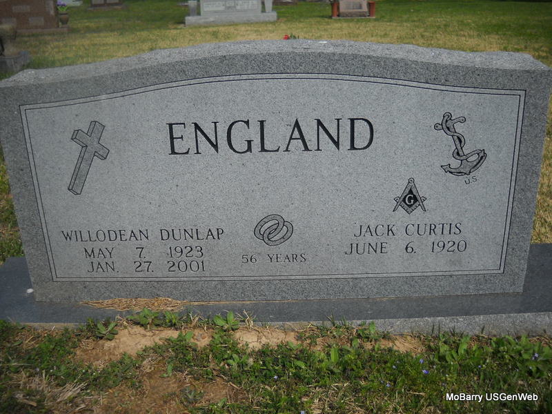 SSW: Jack Curtis - Inscription: "56 Years" - Research Note: Daughter of John L. and Mary Ellen (Wilson) Dunlap. Donna's Note: Opal Willodean Dunlap England, age 77, of Shell Knob, died January 27, 2001, at her home. She was born May 7, 1923, in Chanute, Kansas, and was a daughter of John L. and Mary Ellen Wilson Dunlap. She moved to the Eagle Rock area about 1925 and to Washburn about 1930. She moved to Aurora about 24 years ago. She was a former member of the Order of the Eastern Star in Catoosa, Oklahoma, and the First Christian Church in Cassville. She married Jack Curtis England on December 3, 1944, in Tulsa, OK. She was preceded in death by one brother, John Dunlap, Jr. | Monett Times Jan. 29, 2001 Mary Homesley Note Photos Donna Cooper |