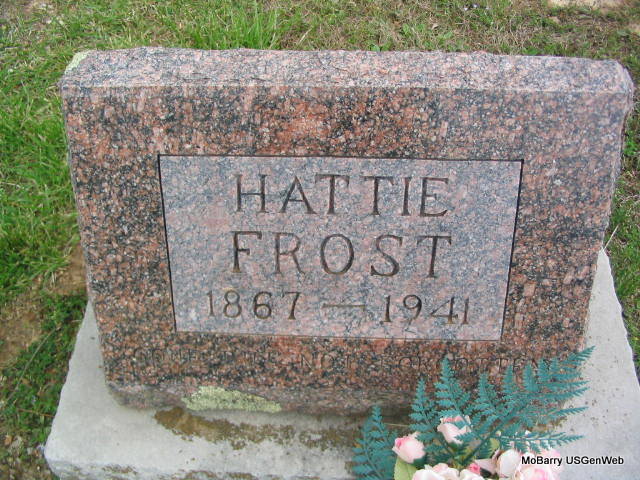 Research Note: According to her death certificate, she was a daughter of Alexander Campbell Chadd (born IN) and Ellen Davis (born IL). D. D. Laney of Washburn, MO was the informant. Donna's Note: Her stone has 1867 for her birth date on it. Hattie first married Samuel Trowbridge on Oct. 8, 1893 at Washburn, Barry Co., MO. Mrs. Hattie Trowbridge of Washburn, Barry Co., MO married John A. Frost of Washburn, Barry Co., MO on Nov. 6, 1932 in Asbury, Jasper Co., MO. She was the second wife of John A. Frost. | Death Certificate MO Marriage Records Photo Phyllis Long Note Donna Cooper |
