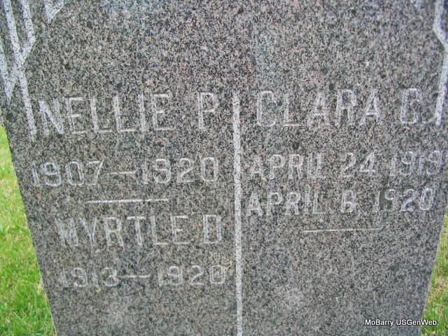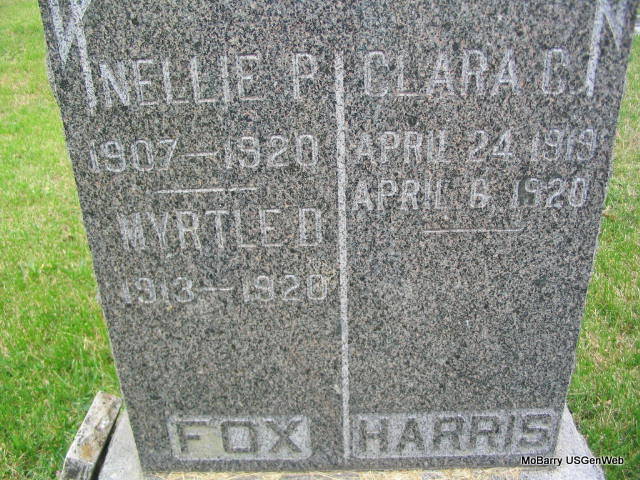 SSW: Myrtle D. and Clara C. Harris - Research Note: Her death certificate reads that Don R. Fox, born MI was her father and Addie F. Armstrong, born KS was her mother. Her death was caused by a fire. The stone reads that Nellie was born 1907. 1920 Census, Mcelroy, Pawnee, Oklahoma - Don R. Fox age 35, Addie age 33, Nellie P. age 13, Pansy age 11, George age 10, Dora age 7, Myrtle age 6, Frank age 4, Ora, age 3, Iva age 1, Don R. Jr age 0, Frank P. Armstrong (Addie's father), age 64. - In 1930, they are in Tulsa, OK and have added more children. - Another Photo - Footstone | Death Certificate Donna Cooper Census Photos Phyllis Long |