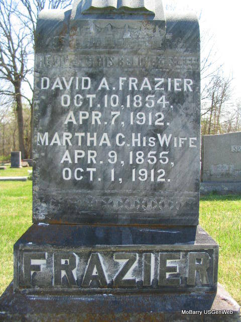 SSW: David A. - Inscription: "His Wife" - Research Note: Washburn News: Mr. and Mrs. John Black went to Joplin Tuesday to accompany the remains of the latter's mother, Mrs. Frazier, to the this place for burial. Her funeral was preached by Rev. P. H. Hodge at the residence after which she was laid to rest by her husband at Washburn Prairie Cemetery. Her death certificate reads that she was a widow, a daughter of George Morris, born near Marionville, MO, and Flora Phillips, born Lexington, KY. Mollie Black, daughter, Joplin, MO, was the informant. | Online Newspapers Oct. 10, 1912 Cassville Republican Death Certificate Donna Cooper Photo Phyllis Long |