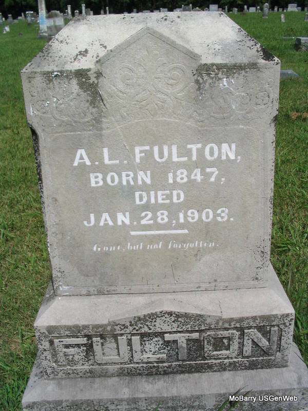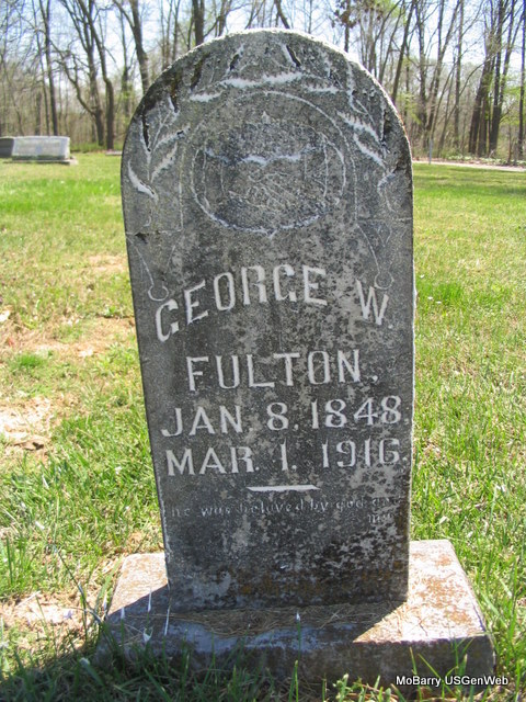 Research Note: Son of Alphonsus J. Fulton and Margaret M. Beard. His wife was Cornelia A. Kibler, died 1942 and is buried at Mt. Hope Cemetery, Kansas City, KS. - Mar. 9, 1916, Cassville Republican - Washburn Prairie News: Geo. Fulton died at the home of his son, Walter, in Dry Hollow, March 1, after only a short illness of pneumonia, age 68 years, 1 month and 21 days. He leaves to mourn his death a wife, three daughters, Mrs. Jim Bryan of Joplin, Mrs. Frank Bryan of Louray, Kans., and Miss Ethel of Lockwood, MO., and two sons, Walter and Will. Mr. Fulton's home was at Joplin. He and his wife were only here for a visit when he took sick. He was a member of the Baptist Church. Funeral services were conducted by P. H. Hodge, Friday at 1 p.m. at the Washburn Prairie Church after which his body was laid to rest in the cemetery nearby. - 1900 Census, Missouri, Barry, Washburn, District 16 - George Fulton, born Oct. 1846 KY, age 55, married 20 years, parents born KY - Nealy, wife, born Jan. 1853 TN, age 48, mother of 5 children, 2 living - Walter, son, born Feb. 1884 MO, age 16 - Ethel, daughter, born May 1890 MO, age 10. | Online Newspapers Donna Cooper Census MO Marriage Records Photo Phyllis Long |
