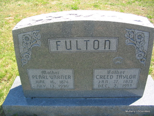 | FULTON, Creed Taylor | Jan. 27, 1873 | Dec. 02, 1953 | SSW: Pearl Varner - Research Note: His parents were Hasten and Jester E. Fulton. He married Oct. 14, 1894, Barry Co., MO, to Missouri Pearl Varner. - Dec. 22, 1910, Cassville Republican, Barry Co., MO - Washburn Prairie: Born to Mr. and Mrs. C. T. Fulton, Friday, Dec. 23, a fine bouncing boy, mother and babe doing well and it is thought that Creed will recover. Note: This son was Kenneth. - 1920 Census, Missouri, Barry, Washburn, District 22 - Creed T. Fulton, age 47, born MO - Pearl wife, age 36, born MO - Eugene (Kenneth), son, age 9, born MO - Jeston, son, age 4, born MO. | Note Donna Cooper Online Newspapers Census Photo Phyllis Long |
