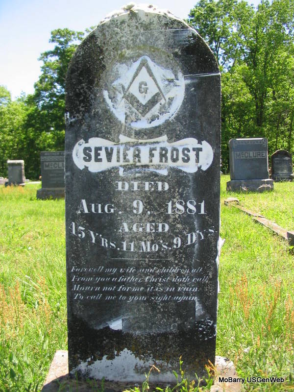 Aug. 9, 1881 | Inscription: "Aged 45 Y'rs, 11 Mo's, 9 D'ys" - Research Note: He was the son of Elijah Frost and Amelia (Mollie) Lonesome Patterson. Sevier Frost first married Elizabeth Savira McGlothlin on Apr. 18, 1859 in Barry Co., MO. Notes at rootsweb say they were divorced. Sevier Frost second married Mollie R. Peach on Dec. 25, 1869 in Barry Co., MO. - 1860 Census, Missouri, Barry, Sugar Creek - Sevier Frost, age 24 born TN - E.S. (Elizabeth), age 16 born MO - Matthew, age 34, born TN. - 1880 Census, Arkansas, Benton, Sugar Creek, District 13 Sevier Frost, age 45, store keeper, born TN - Mollie, age 29, wife, born OH, Early, son, age 10 born MO - Hardy, son, age 8, born AR - Cora, daughter, age 6, born AR - Charlie, son, age 4, born AR - Lee, son, age 2, born AR - Willie, son, age 6 months, born Oct. AR - General, son, age 16, born AR - Sarah Henson, age 21, servant, born MO - A. J. Read, age 22, servant born MO. In the next 2 households are Winter age 40 and wife Darthula Frost with family, and Young age 37 and wife Kate Frost and family. | Census MO Marriage Records Photo Phyllis Long |