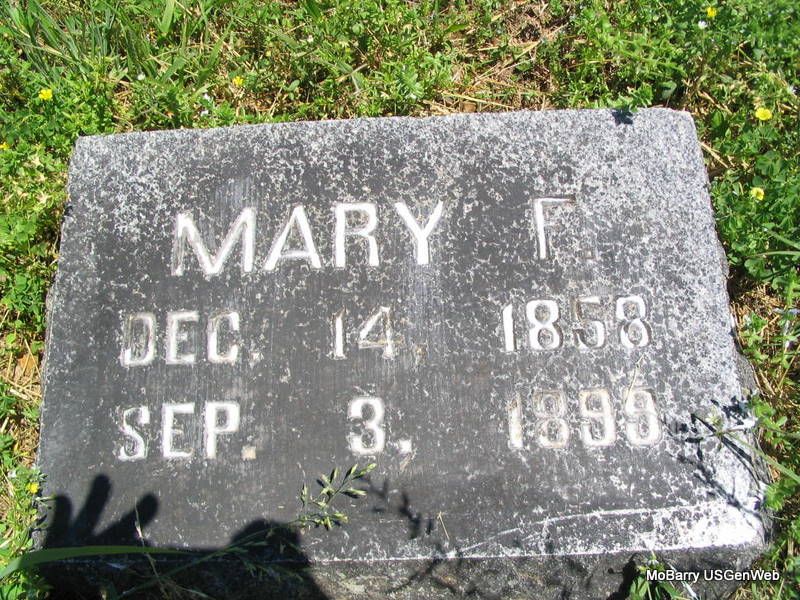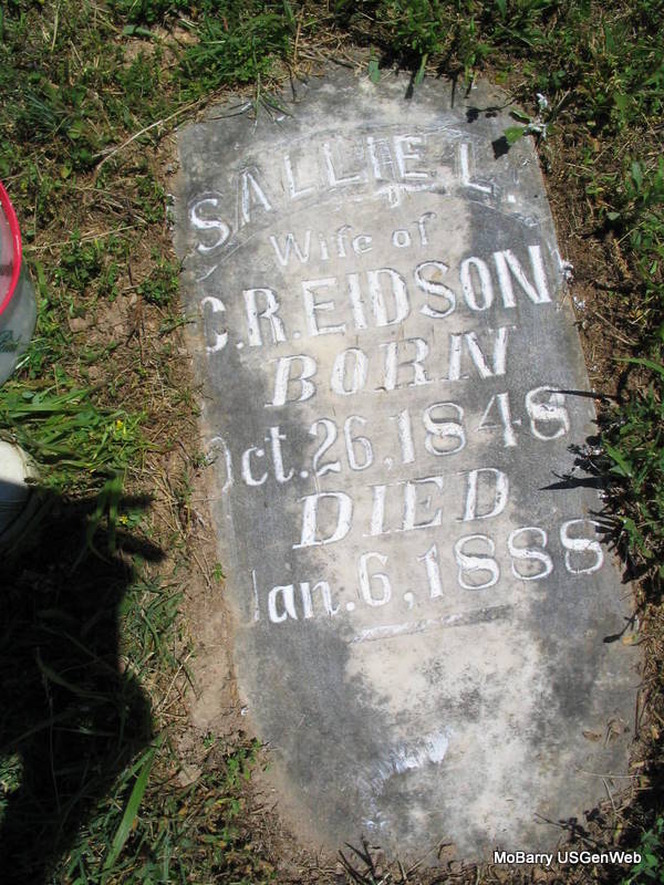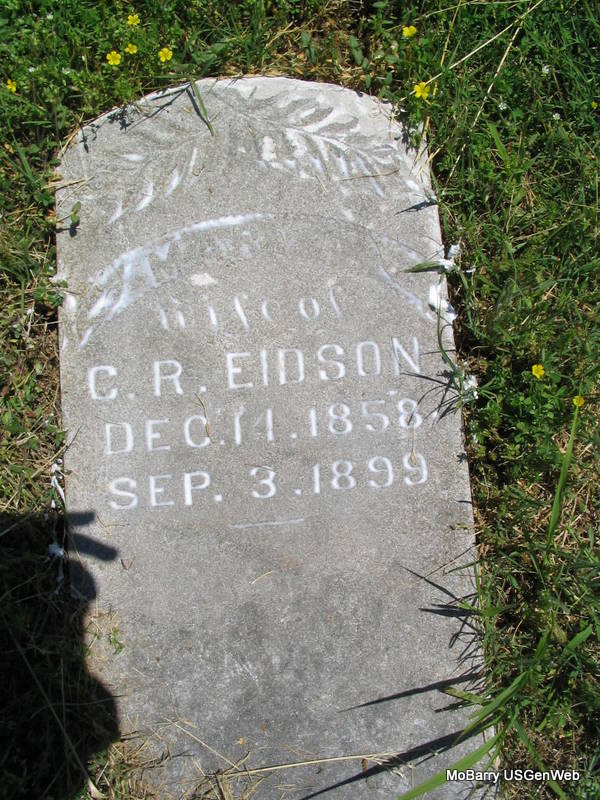| EIDSON, Mary F. (DALEY) | Dec. 14, 1858 | Sept. 3, 1899 | Research Note: The second wife of Clifton Rhodes Eidson. C. R. Eidson married Mary F. Daley on July 26, 1888 in Barry Co., MO. Her old stone is off its base and flat on the ground. - Old Stone - Plot Stone | Note Donna Cooper MO Marriage Records Photos Phyllis Long |