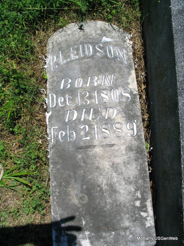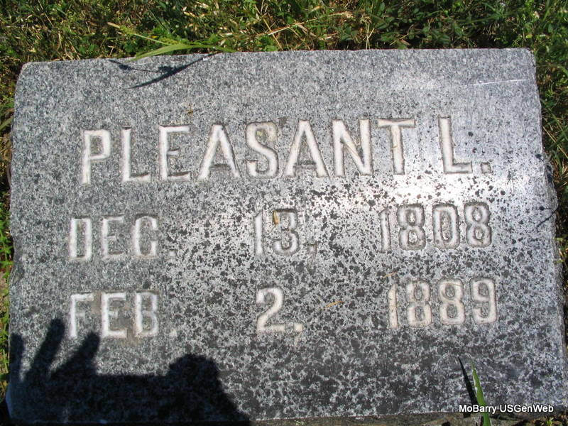 Research Note: His wife was Mary Ann Lowe, daughter of Ralph Lowe and Eve Fresh. 1850 Census, Kentucky, Logan, District 1 - Mary Eidson, age 81, born VA (probably Pleasant's mother) - Pleasant L. Eidson, age 41, born KY, Clifton Eidson age 9, born KY. - In 1880, Pleasant was a widower living with his son Clifton R. Eidson in Henry Co., MO, and was age 71, born in VA and both of his parents were born in VA, Clifton, however was born in KY. His old stone is off its base and flat on the ground. - Newer Stone - Plot Stone | Note Census Donna Cooper Census Photos Phyllis Long |