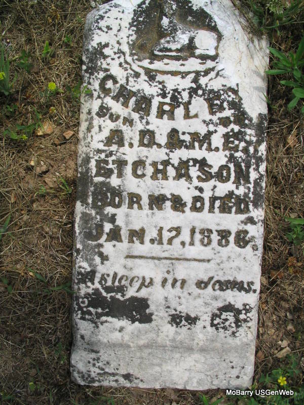 | ETCHASON, Charley | Jan. 17, 1886 | Jan. 17, 1886 | Inscription: "Son of A. D. & M. E." - Research Note: Son of Ambrose Dudley and Mary Ellen (Basinger) Etchason. This stone is off its base and flat on the ground. | Note Photo Phyllis Long |