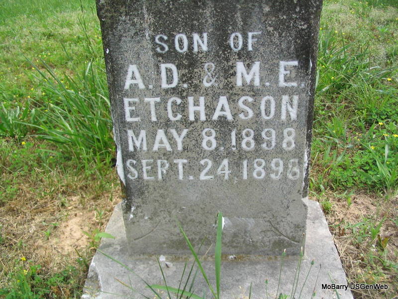 | ETCHASON, Jessie | May 8, 1898 | Sept. 24, 1898 | Inscription: " Son of A. D. & M. E." - Research Note: He was a son of Ambrose and Mary Ellen Etchason. | Note Donna Cooper Photo Phyllis Long |