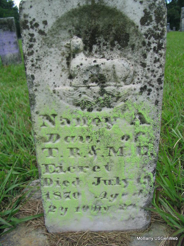 | EACRET, Nancy Ann | Aug. 20, 1867 | July 9, 1870 | Inscription: "Dau. of T. R. & M. E. - Aged 2 Yrs. & 10 Ms." - Research Note: She was the daughter of Thomas Robertson Eacret and Maryetta Graston. George Longley is buried next to her. | Note Photo Phyllis Long |