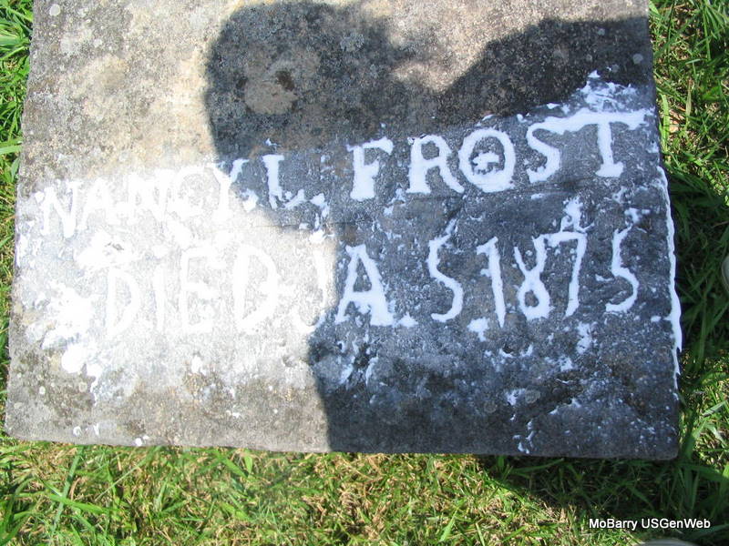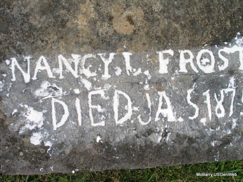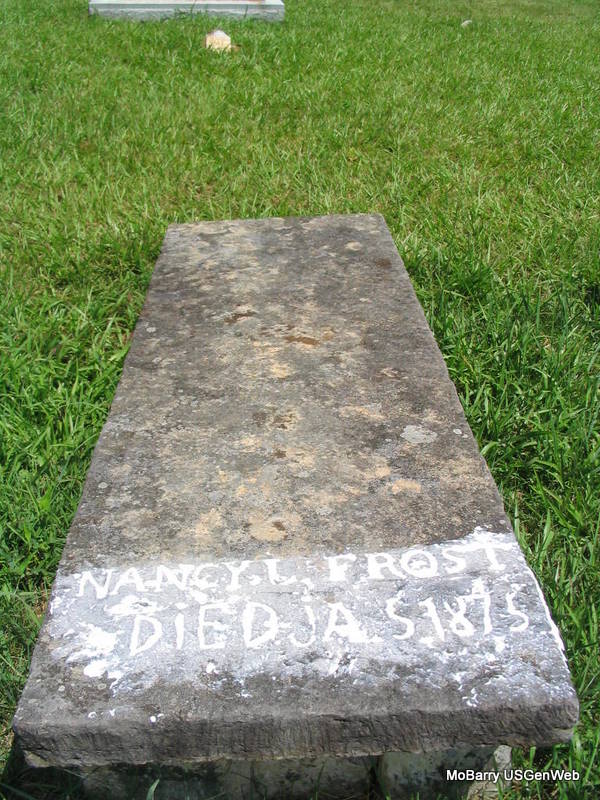 | FROST, Nancy L. | No Date | Jan. 5, 1875 | Research Note: this is one of the flat slabs in the middle of the cemetery. - Another Photo - Another Photo - Another Photo | Photo Darla Ball Marbut Photos Phyllis Long |