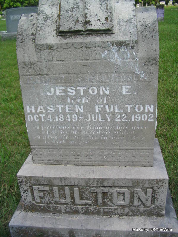 Research Note: His death certificate names A. L. Fulton, born MO, as his father and Fannie Johnson, born MO, as his mother. Researchers and MO Marriage Records say his father was Creed T. Fulton. - He married in Barry Co., MO, Jesten E. Price, Apr. 14, 1870. - Time has again taken a former old time settler and citizen of Barry Co. He served in the Civil War 2 years and 2 months. He moved to Barry County in 1866,and in 1870 was married to Miss Jeston E. Price, who died in 1902. To this union were born four children, three of whom are living: Mrs. Eli Sooter of Urbenett, AR, Creed Fulton of Washburn and Grover Fulton of Cordin, OK, Price Fulton having died at the age of six months. In 1903 he was married to Miss Lou Dawe, by whom he is survived. In 1915 he moved with his family to Granby, where he lived until his death. - Civil War Veteran - Private, Co. M, 6th KS CAV., Enlisted in 1863, Discharged Sept. 15, 1865. | Note Donna Cooper 1890 Vet. Census Obit Photo Phyllis Long |