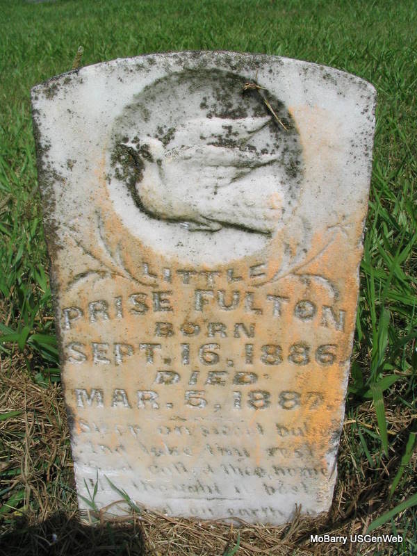 | FULTON, Prise | Sept. 16, 1886 | Mar. 5, 1887 | Inscription: "Little Prise Fulton" | Photo Phyllis Long |