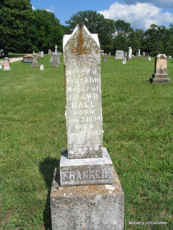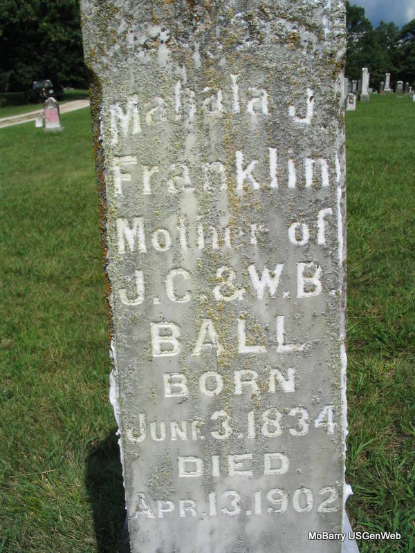 Apr. 13, 1902 | Inscription: "Mother of J. C. and W. B. Ball" - Research Note: In 1900 Mahala was listed in Washburn Twp., in household 210 as Mahala Franklin. She was born in TN, and age 63, born in Jan. 1837 according to the online transcription of the census. - Another Photo | Headstone Darla Ball Marbut Note Donna Cooper Photos Phyllis Long |