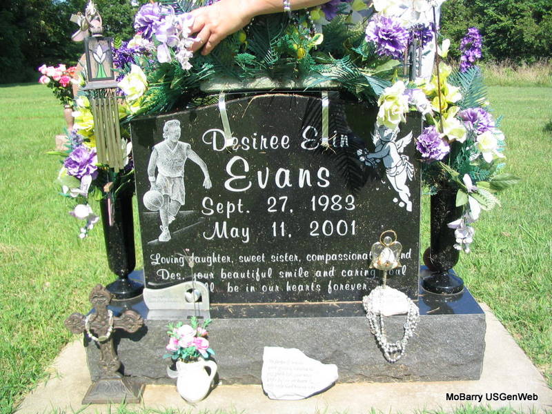 Research Note: According to the Monett Times, Desiree Erin Evans, age 17, of Seligman, died May 11, 2001, at Cox Medical Center South in Springfield from injuries sustained in a traffic accident. She was born September 27, 1983, in Monett. She was a junior at Southwest of Washburn High School. Survivors include her parents, Dennis and Donna (Wilson) Evans; two sisters, of Magnolia, Arkansas, and of Springfield; her grandmothers, of Washburn and of Seligman; one niece, one nephews, and several aunts and uncles. Monett Times, May 15, 2001. | Monett Times May 15, 2001 Mary Homesley Obit Note Donna Cooper Photo Phyllis Long |