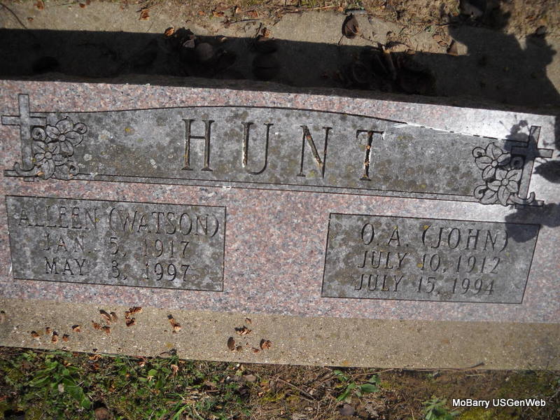 | HUNT, Alleen Jewell (MONTGOMERY) (DILLENDER) (WATSON) | Jan. 5, 1917 | May 3, 1997 | SSW: O. A. - Research Note: Daughter of Hugh Timothy Montgomery and Jessie Lenore Stacy. She married Alonzo Todd Dillender on Apr. 13, 1936 in Cassville, MO. Divorced in 1940. She married Gaylon Wayne Watson on Aug. 9, 1942 in Jackson Co., MO. She married Orial A. "John" Hunt on Sept. 10, 1973 in Miami, Ottawa Co., OK. | Census MO Marriage Records Phyllis Long Photo Donna Cooper |