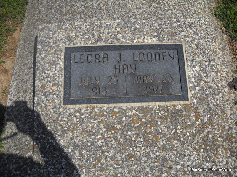 Research Note: She married Nolan Gail "Pete" Hay. 1920 Census says Leora was born in MO, 1930 has KS. Daughter of David Daniel Looney and Nellie Mae Chadd. - 1920 Census, Missouri, Barry, Washburn, District 22 - David Daniel Looney, age 47 born MO - Nellie, wife, age 38, born IA - Mabel, daughter, age 20, born MO - Carrol, son, age 18, born MO - Nella, daughter, age 12, born MO - Velma, daughter, age 12, born MO - Hazel, daughter, age 7, born MO - Leora, daughter, age 4, born MO. - 1930 Census, Missouri , Barry, Washburn , District 29 - Dugan E. Looney, age 52, born IL - Nellie wife, age 49, born IA - Velma, daughter, age 21, born MO - Leora J., daughter, age 13, born KS, Ivan W., son, age 10, born MO. | Census Phyllis Long Note Photo Donna Cooper |