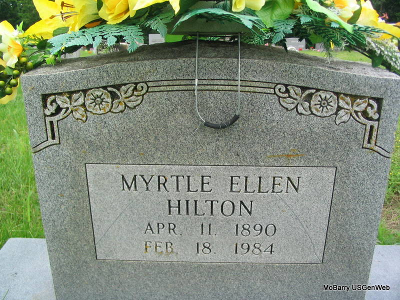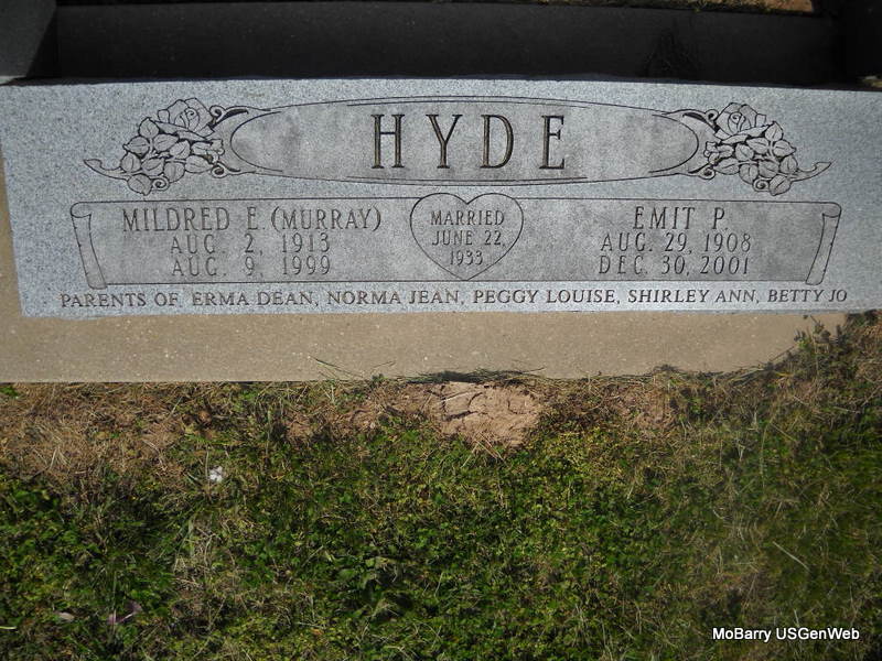 SSW: Emit Paul - Inscription: "Married June 22, 1933" - Research Note: Wife of Emit Paul Hyde. Dau. of Luther & Lucy Dean (Mills) Murray. Donna's Note: Mildred E. Hyde, age 86, of Washburn, died August 9, 1999, at South Barry County Hospital in Cassville following a brief illness. She was born August 2, 1913, in Garfield, AR, and was a daughter of Luther and Lucy Dean (Mills) Murray. She and her husband owned and operated the Phillips 66 Station in Washburn from 1943 to 1984, and was a member of the United Methodist Church in Washburn where she taught Sunday school. She married Emit P. Hyde on June 22, 1933, in Bentonville, AR. She was preceded in death by one daughter, Erma Hilton. - Another Photo | Cassville Democrat Aug. 11, 1999 Mary Homesley Monett Times Photos Donna Cooper |