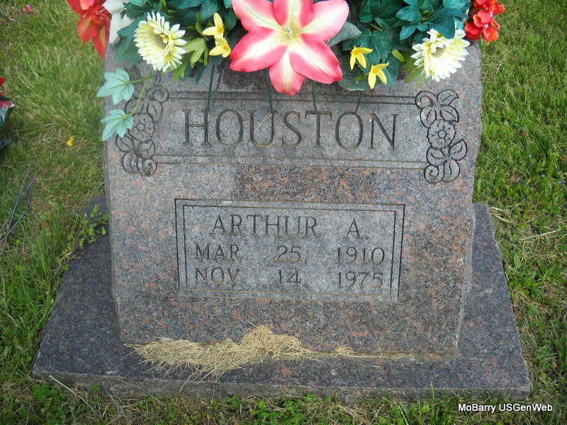 | HOUSTON, Arthur Algard "Tuffy" | Mar. 25, 1910 | Nov. 14, 1975 | Research Note: His wife was Wanda Adeen Harris. He was the son of Marion Edwin Houston and Maggie Myers. - 1920 Census, Missouri, Barry, Washburn, District 22 - Edwin Houston, head, age 41 born AR; Maggie, wife, age 32 born AR; Loyd, son, age 17 born AR; Clyde, son, age 12, born AR; Arthur, son, age 9 born AR; Harold, son, age 5, born MO. | Census Phyllis Long Photo Donna Cooper |