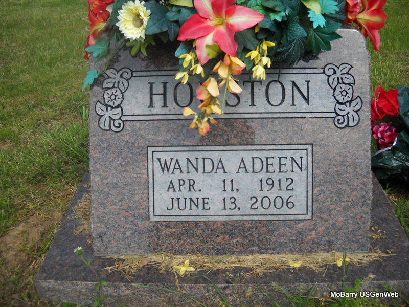 Research Note: Wanda A. Houston, age 94, of Cassville, died June 13, 2006, at Red Rose Inn in Cassville. She was born April 11, 1912, in the State of Oklahoma, the daughter of Marian and Bessie (Waldon) Harris. She was a homemaker and a member of Mt. Olive Baptist Church. She married Arthur A. "Tuffy" Houston in 1929 and he preceded her in death on November 27, 1975. Survived by two sons and one daughter. She was preceded in death by one daughter, Betty Appelhans; and one grandchild. | Monett Times June 15, 2006 Phyllis Long |