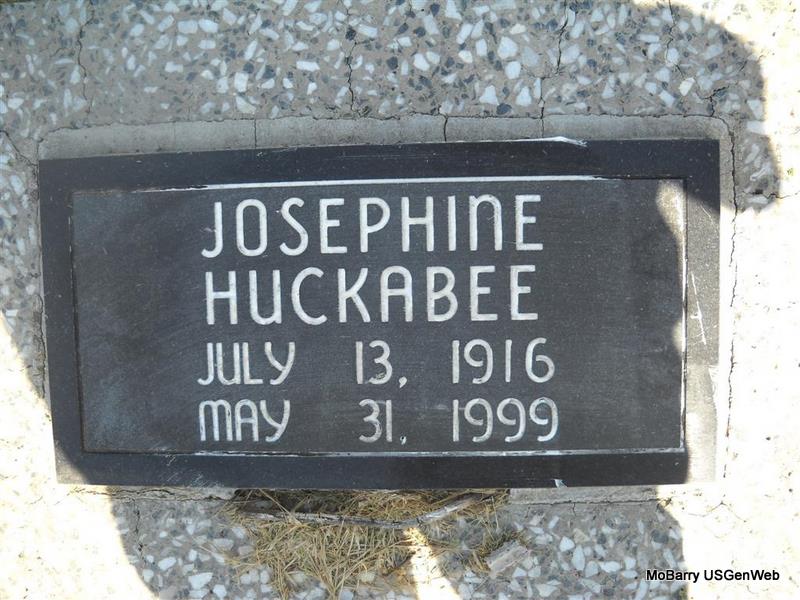Research Note: In Abstract - Josephine Huckabee, age 82, of Cassville, died yesterday, May 31, at Cox Monett Hospital. She was born July 13, 1916, in Holdenville, OK, and was a daughter of Bates L. and Mary Lou (Page) Loftis. She moved in 1965 from Texas to Missouri, ranched on Flat Creek, moved to Cassville in 1975, and moved to Monett in 1998. She was a member of the First Baptist Church in Cassville. She married Horace E. Huckabee on December 31, 1936, in Clovis, NM, and he preceded her in death in May of 1979. She was preceded in death by one brother, Jack Loftis; and two sisters, Opal Farris and Bessie Latham. | Online Obit Monett Times June 1, 1999 Phyllis Long Photo Donna Cooper |