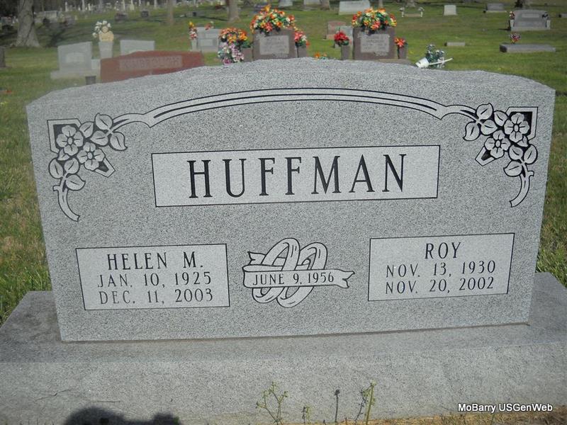 SSW: Helen - Inscription: "Married June 9, 1956" - Research Note: Roy Huffman, age 72, of Goleta, California, formerly of Washburn, died November 20, 2002, at his home. He was born November 13, 1930, in Washburn, the son of Pansy Fox and Roy Herald Huffman. He moved to California his senior year of high school. He worked in a lumber mill for a year. He was an Army veteran of the Korean conflict. He worked for Joslyn Electronics for 37 years, retiring 10 years ago. He married Helen Chatfield on June 9, 1956, in Chicago, Illinois. | Monett Times Nov. 27, 2002 Photo Donna Cooper |