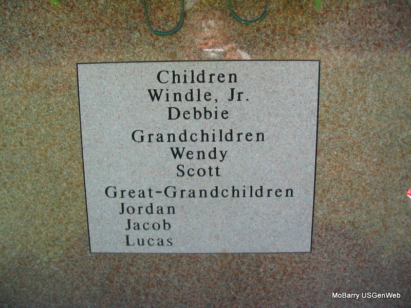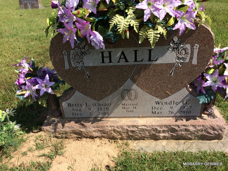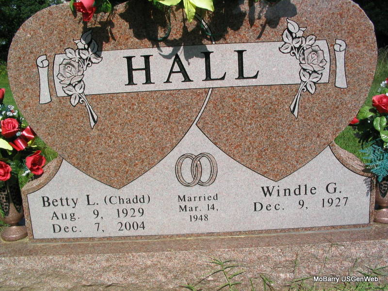 SSW: Windle G. - Inscription: "Married Mar. 14, 1948" - Research Note: She married Windle Hall on March 14, 1948, and was the daughter of Troy and Marie (Elgin) Chadd. She was a teller for the Bank of Seligman for 30 years. She was preceded in death by two brothers, Clifford and Howard Chadd. - Back of Stone | Monett Times Dec. 10, 2004 Photos Phyllis Long |