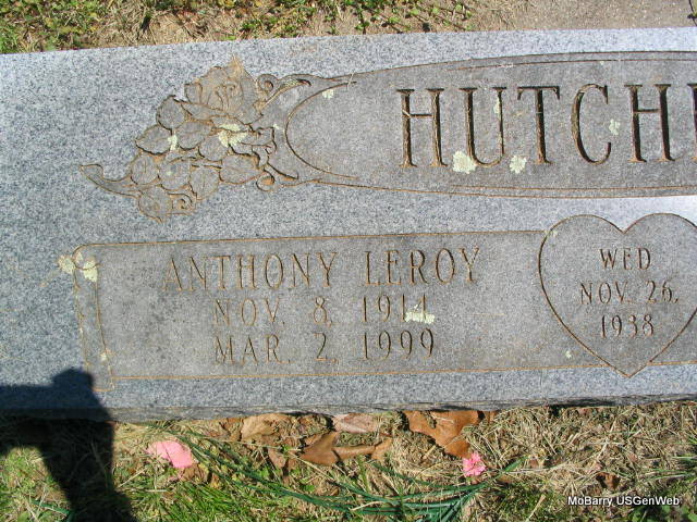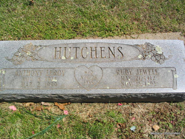 Research Note: He is buried next to Eugenia Mary, his wife and Dorothy Gene Hutchens, his daughter. He was the son of Evan Marshall Hutchens born 1853 in NC and Martha Ellen Hayes born 1859 MS. - Apparently married a second time as the death certificate says he was divorced. Eugenie died in 1947. Usual residence was rural Washburn, MO. Jethro Hutchens of Cassville, MO was the informant. At age 32, he married Eugenie Eidson, age 17, on July 28, 1907 in Barry Co., MO. - 1930 Census, Missouri, Barry, Washburn, District 29 - William W. Hutchens, head, age 45, born MO, father born NC, mother MS, farmer; Eugenia L., wife, age 40, born MO, father born KY, mother AR; Clifton R., son, age 18 born MO; Anthony L., son, age 15 born MO; Herman H., son, age 13 born MO; Jewell R., daughter, age 8, born MO; Martha K., daughter, age 6 born MO; Leora M., daughter, age 2, born MO; Jethro C., son, age 20 born MO; Bess, daughter-in-law, age 20, born MO, parents born MO. - Plot Stone | Census Death Certificate MO Marriage Records Photos Phyllis Long |