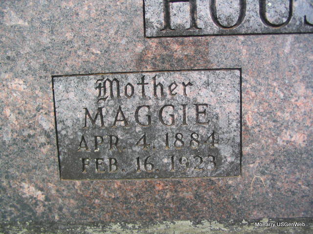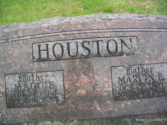 SSW: Maggie - Research Note: According to his death certificate his wife was Maggie Houston and his occupation was section hand for the railroad. He was a son of John Houston born Madison Co., AR and Nancy Ann Poyner, born AR. Loyd Houston of Washburn, MO was the informant. Cause of death was cerebral embolism. - 1920 Census, Missouri, Barry, Washburn, District 22 - Edwin Houston, head, age 41 born AR; Maggie, wife, age 32 born AR; Loyd, son, age 17 born AR; Clyde, son, age 12, born AR; Arthur, son, age 9 born AR; Harold, son, age 5, born MO. - Maggie has died and Marion has married his second wife Emma Viola Guiles. - 1930 Census, Missouri, Barry, Washburn, District 29 M. E. Houston, age 50, born AR, railroad laborer; Emma, wife, age 53, born MN, father born NY, mother NC; Arthur, son, age 20 born AR, garage mechanic; Harold, son, age 14 born MO; Helen, daughter, age 8, born MO. Helen has to be the daughter of Emma and Marion. - Another Photo | Death Certificate Census Photos Phyllis Long |