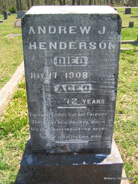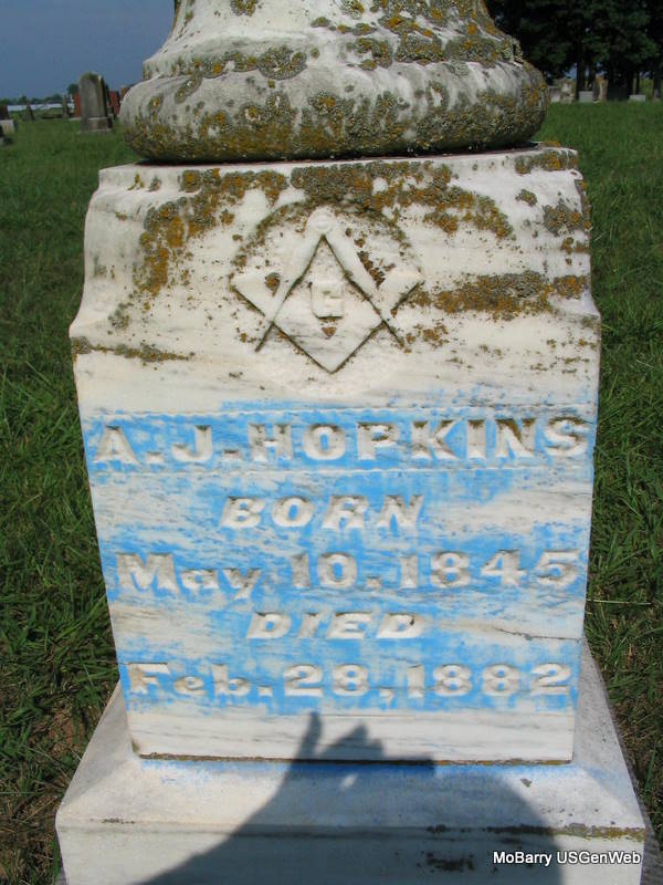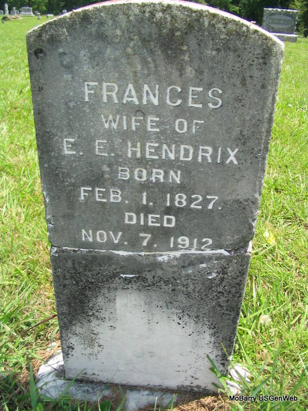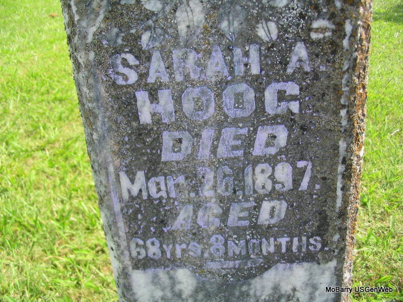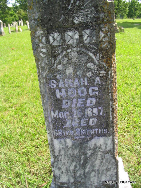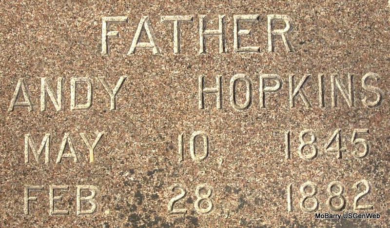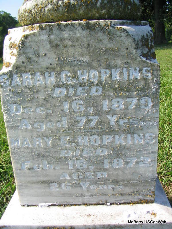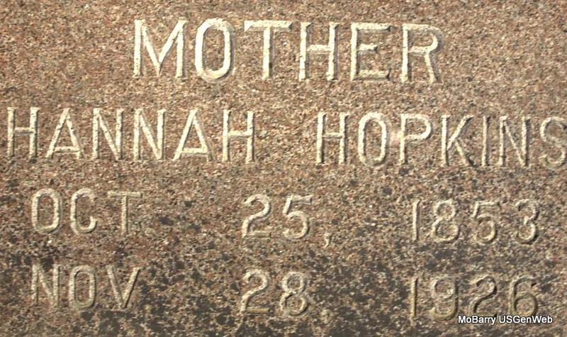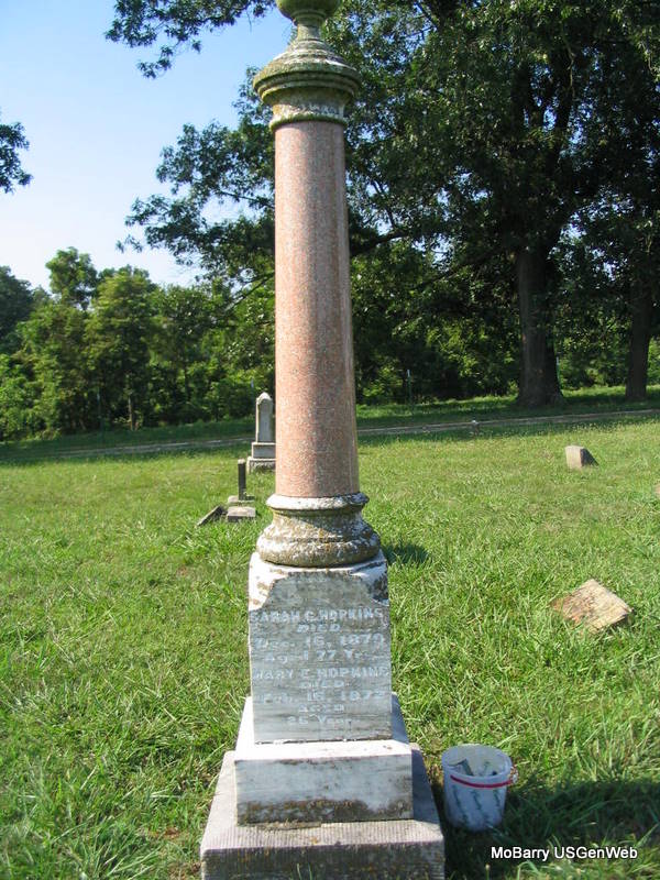 | HOPKINS, Sarah C. | Abt. 1793 | Dec. 16, 1870 | SSW: A. J. Hopkins and Mary E. Hopkins - Inscription: "Aged 77 Years" - Research Note: According to 1880 Census, Sarah was born about 1810. Her death date on the stone is 1870 but she is still living in 1880 with her son Andrew J. Hopkins Sr. and family. - 1880 Census, Sugar Creek, Barry, Missouri - Andy Hopkins, age 35, born TN, parents born TN; Hannah, wife, age 26, born TN; William, son, age 13, born TN; Johney, son, age 5, born MO; Brownlow, age 3, son, born MO; Hattie, age 1, daughter, born MO; Sarah, mother, age 70, born TN. - Another Photo | Census Photos Phyllis Long |