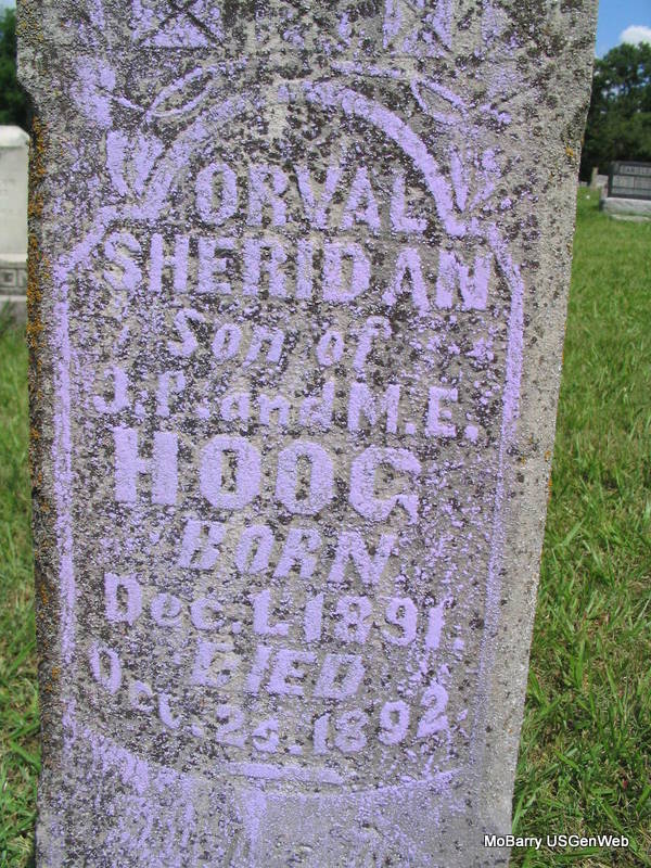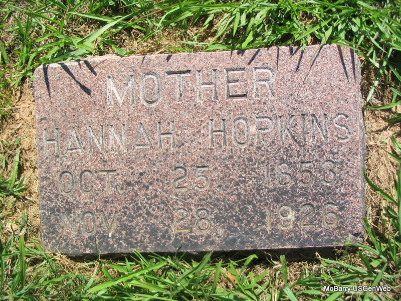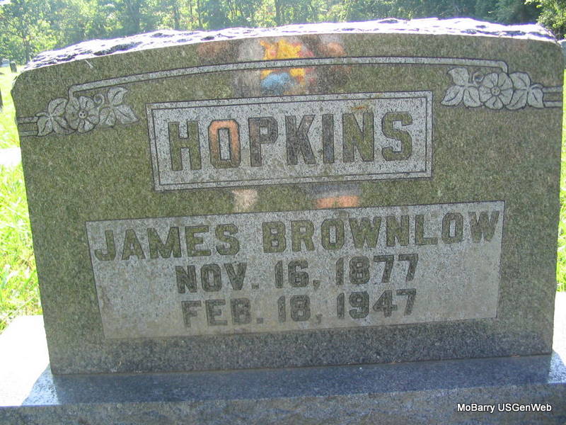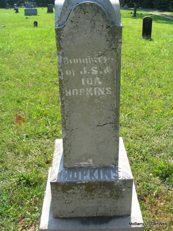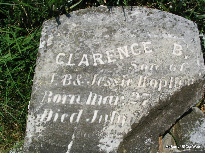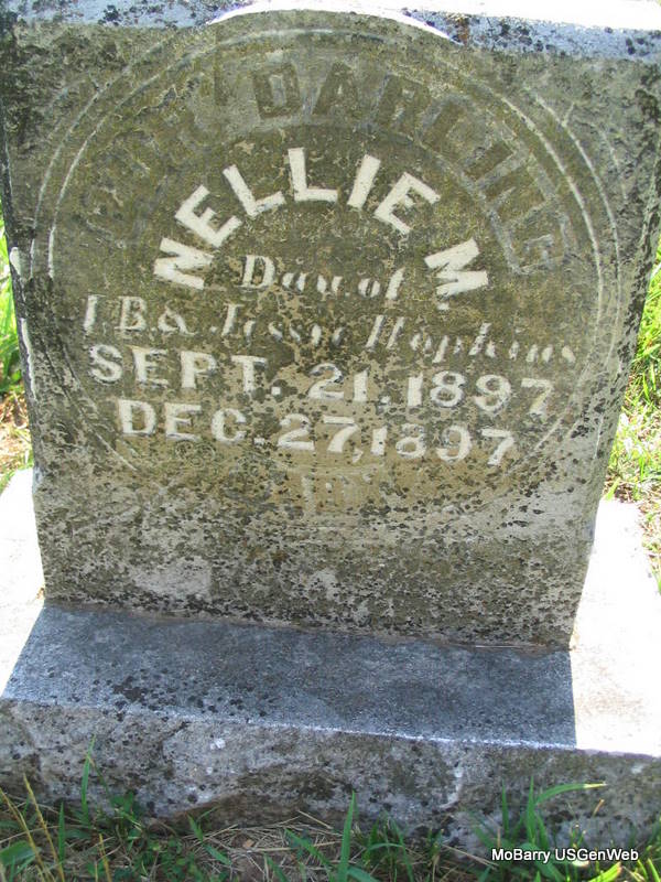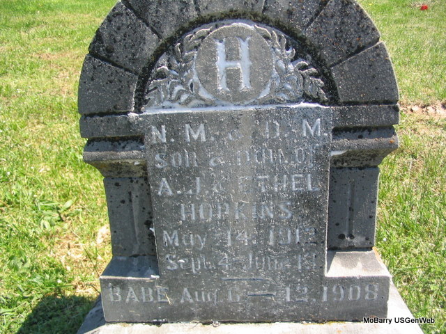SSW: D. M. & Babe - Research Note: September 12, 1912, Cassville Republican - Washburn Prairie News: Friday, Sept. 6, 1912, 7 p.m., the death angel again entered the home of Mr. and Mrs. A. J. Hopkins and taken from them the last one of their twins, little Norris Munford, aged 3 months and 23 days. He was sick only 24 hours with indigestion which time he suffered very much. Funeral services were conducted Saturday at eleven o'clock by Rev. Melvin Coones after which the little body was laid to rest in the Washburn Prairie Cemetery. The sorrowing father and mother have the deep sympathy of the community. Son of Andrew J. Hopkins Jr. born Barry Co., MO and Ethel Stubblefield, born Barry Co., MO. Twin to Dorris Marver. | Online Newspapers Note Photo Phyllis Long |