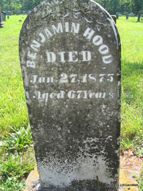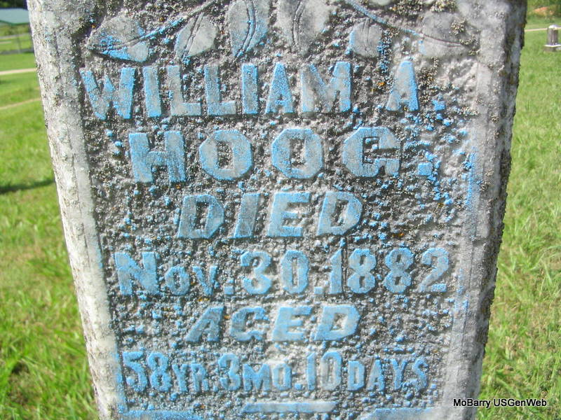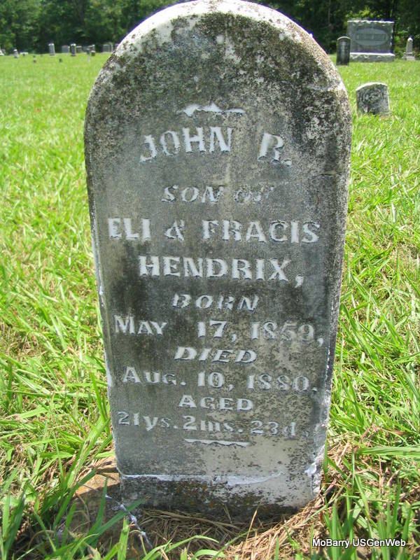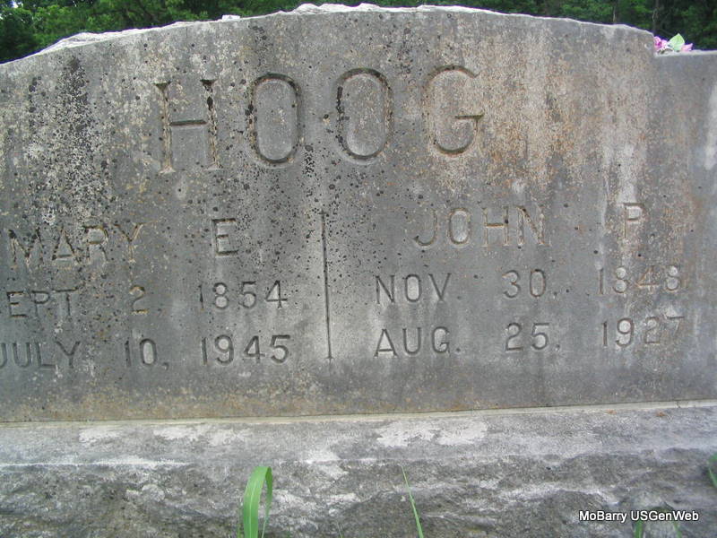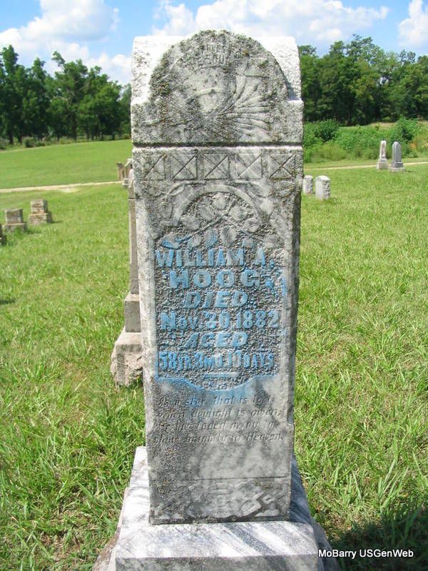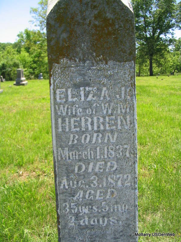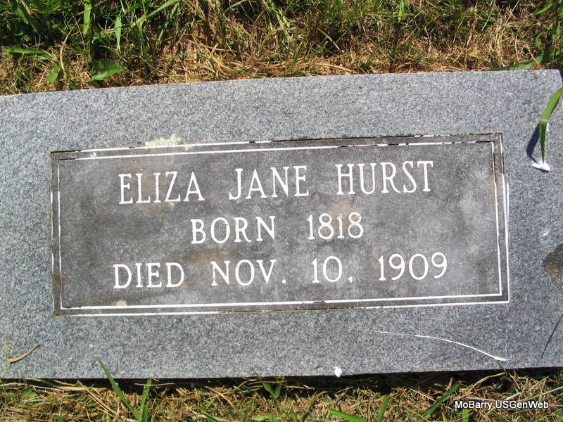 Research Note: Wife of Benjamin Franklin Hurst. There is an unmarked sandstone next to her grave. The online obit has her death in Oct. and stone reads that she died in Nov. Partial Obit: She was born in Todd county Kentucky in 1818, and was united in marriage to Benjamin Franklin Hurst at the age of 23 years, in the same state. Mr. Hurst departed this life in 1874. She with her husband came to Missouri about 42 years ago and has since then been a citizen of Barry County, except 16 years spent in Oklahoma. To this union were born seven children, six boys and one girl. One boy died during infancy. Six children remain to mourn her death. They are John Hurst of Clarksville, Tenn., D.W. Hurst of Texas, Mark Hurst of Idaho, Win S. Hurst of Pawnee, Okla., James Hurst and Mrs. Jennie Hamilton of Washburn. Only two of her sons, James and Win, reached the home of their sister, where their mother died, in time for the funeral. - 1860 Census, Texas, Wise - B. F. Hurst, age 48 born TN; Eliza J., age 43, born KY; John H., age 19, born TN; Lamira? J., age 16, born TN; Daniel W., age 13, born MO; Marcus D., age 11 born MO; Winfield S., age 7, born CA; James B., age 3, born CA. | Online Obit Note Donna Cooper Census Photo Phyllis Long |