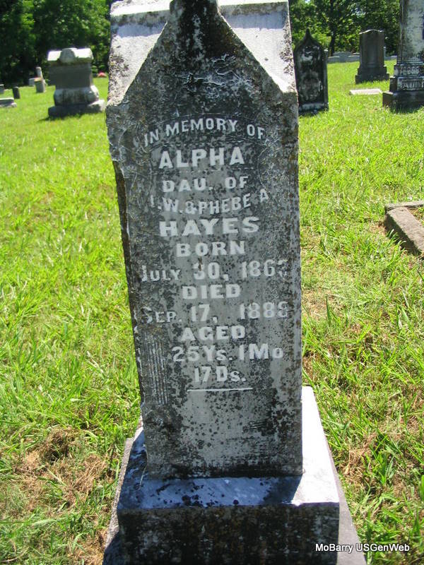 | HAYES, Alpha | July 30, 1863 | Sept. 17, 1888 | Inscription: Dau. of I. W. & Phebe A. Hayes - Aged 25 Ys. 1 Mo. 17 Ds." - Research Note: Isaac W. and Phebe A. Hayes are buried at Corinth Cemetery with their daughter Maud who was murdered by Ben Bethel. | Note Donna Cooper Photo Phyllis Long |