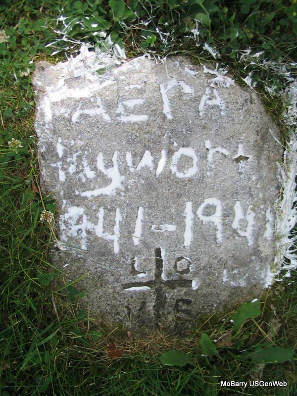 Research Note: His death certificate does not give a place of burial but he is from the same Hayworth family as the other 2 children already listed. Baby boy, 3 hours old. He was a son of Vannie Oliver Hayworth, born KS, and Nellie Leona Guiles, born Kansas City, MO. Informant was Mrs. Hayworth. Cause of death was convulsions. The homemade stone looks like it reads Faera. | Death Certificate Photo Phyllis Long |
