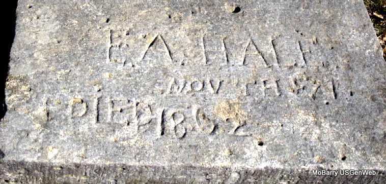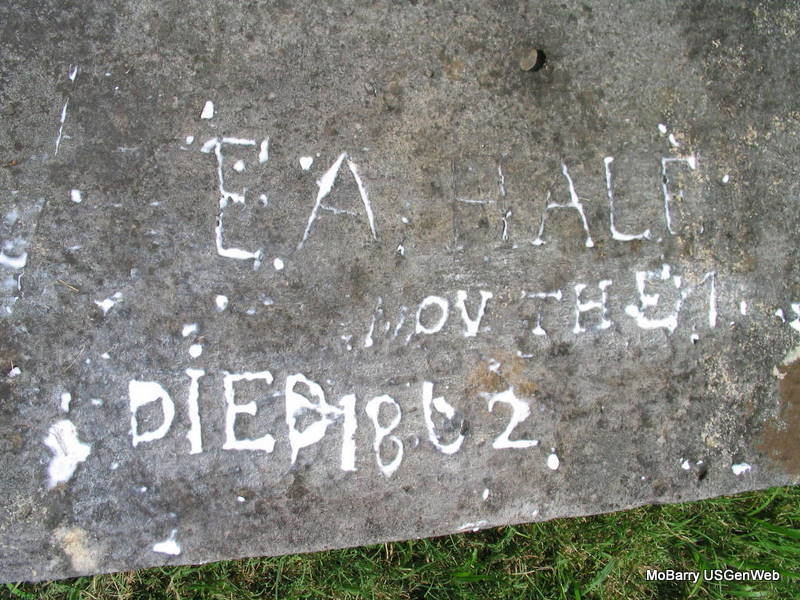 | HALE, E. A. | No Date | Nov. 1, 1862 | Research Note: This is one of the flat slabs of stone that is in the middle of the cemetery. Next to this grave is one for P. K. Kelley - 1870, and one unmarked. - Another Photo | Photo Darla Ball Marbut Photo Phyllis Long |