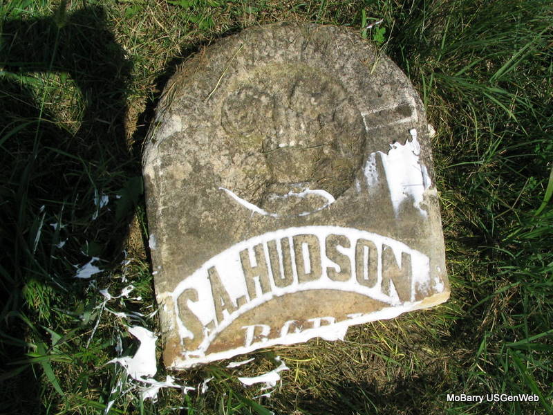 | HUDSON, S. A. | Jan. 6, 1844 | Feb. 13, 1892 | Research Note: Only the name is left on this stone. It is broken and on the ground and has no dates. - Holder for Stone | Note Donna Cooper Photos Phyllis Long |