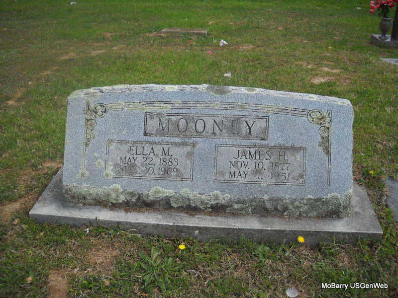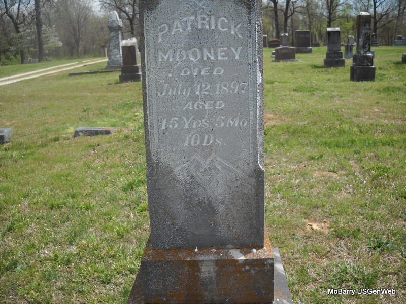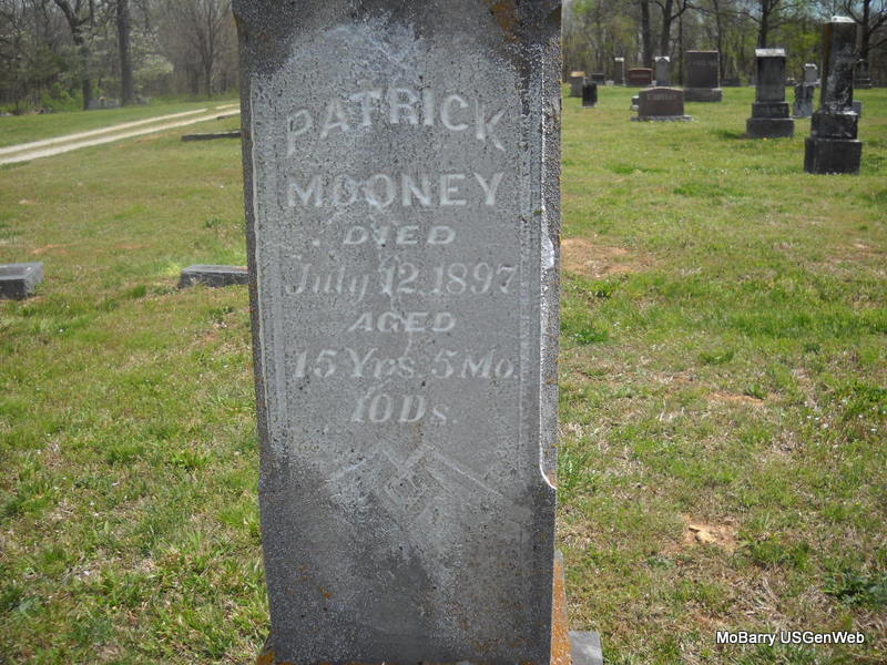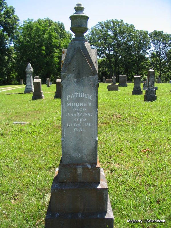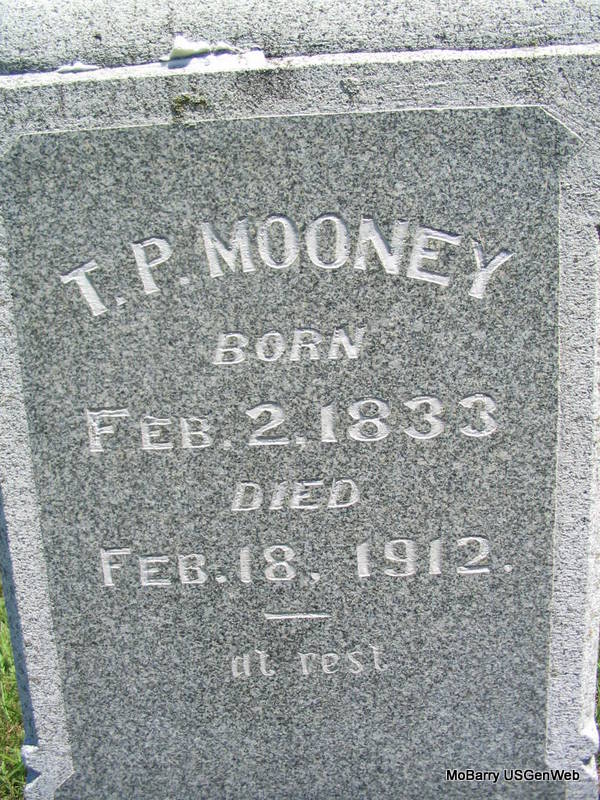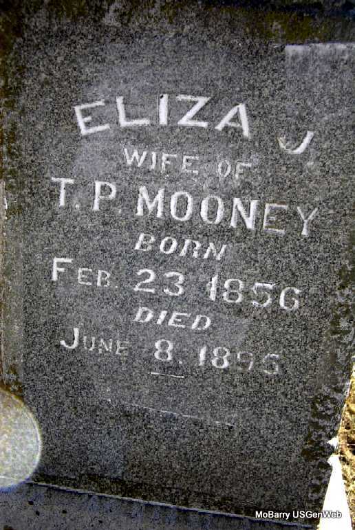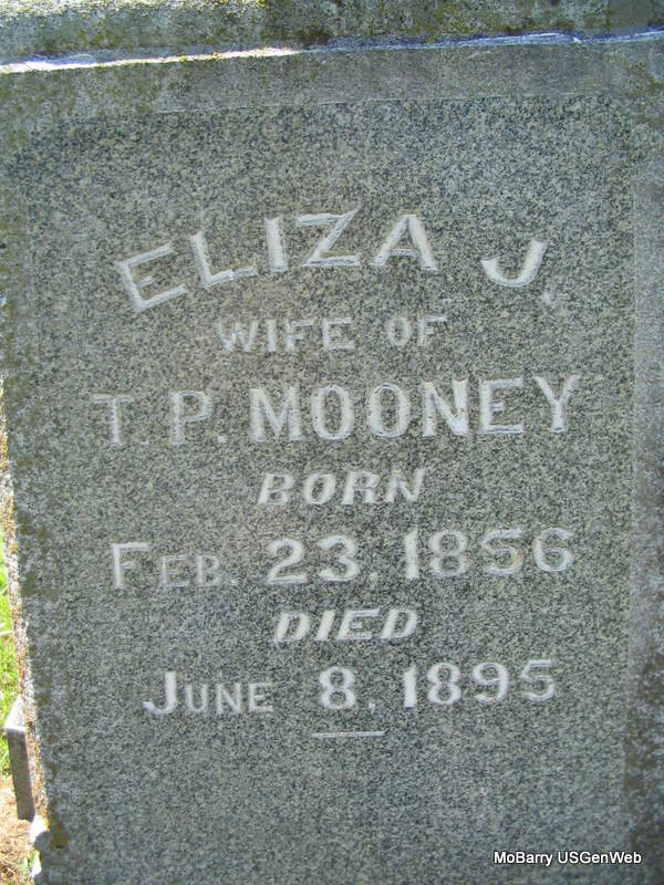 SSW: Timothy Patrick - Inscription: "Wife of T. P. Mooney" - Research Note: Married- Aug. 28, 1875 in Barry Co., MO - Cassville Republican, Thursday, June 13, 1895 - Dr. Mooney, of St. Louis, assisted by Drs. Mitchell and Wooten of Cassville, and Dr. Chandler, of Washburn performed a difficult surgical operation on Mrs. T. P. Mooney of Washburn, Monday, removing a nine pound tumor. Including the fluid, the patient was relieved of at least forty pounds. Mrs. Mooney has been in ill health for some time, but since the operation is improving. She is a sister of Dr. Coppedge of this place. - Another Photo - Another Photo | Photos Family, Census State Hist. Soc. Donna Cooper Photo Phyllis Long |