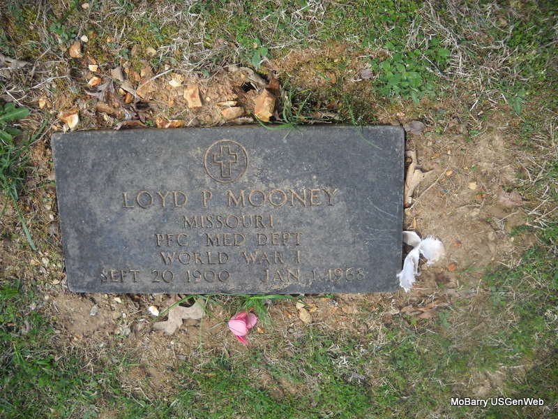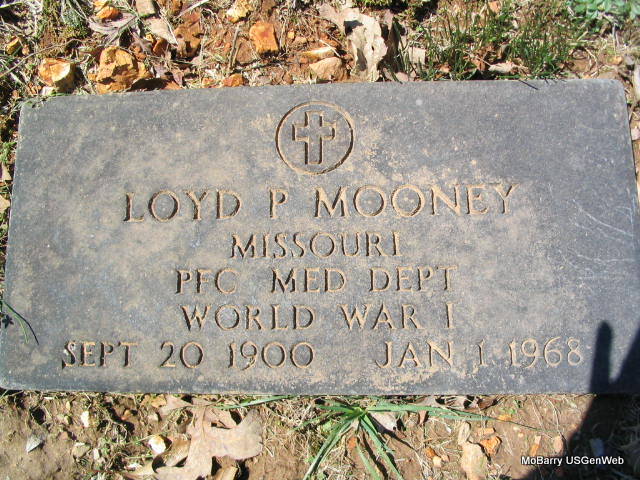 Inscription: "MISSOURI PFC MED DEPT. WORLD WAR I" - Research Note: Next to Loyd is Ruth (Berryhill) (Mooney) Tate, his wife. His parents were James "Jamie"and Ella (Pease) Mooney. - Another Stone - Another Photo - Another Photo | Photos Family Death Certificate Donna Cooper Photos Phyllis Long |