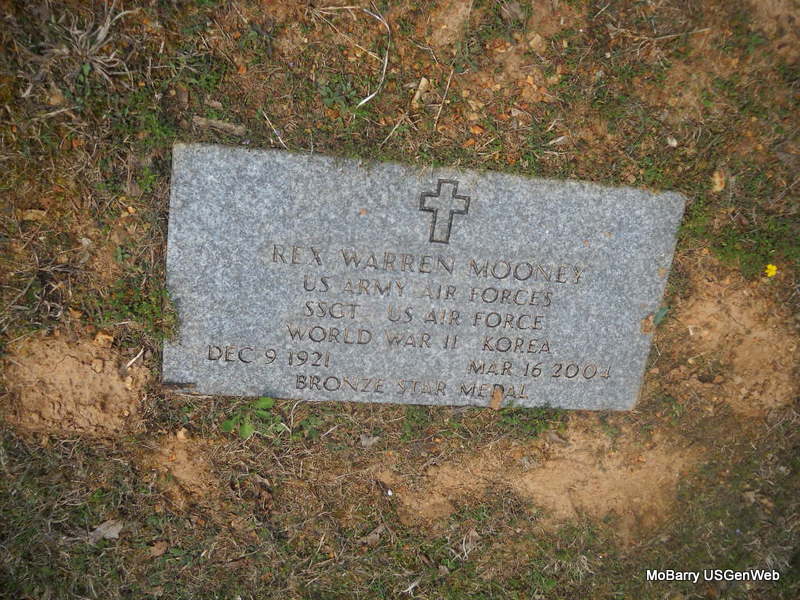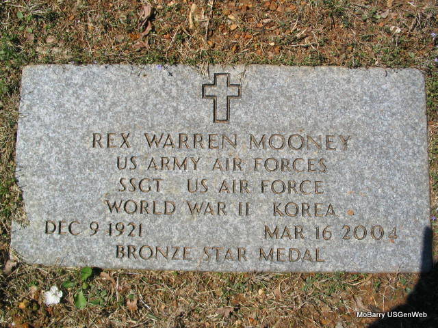 Mar. 16, 2004 | Inscription: "REX WARREN MOONEY - US ARMY AIR FORCES - SSGT US AIR FORCE - WORLD WAR II - KOREA, BRONZE STAR MEDAL" - Research Note: Rex was a son of Jamie H. and Ella (Pease) Mooney. - Marriage License: Rex Warren Mooney age 21 and Ruth Aletha Bennett, age 18, on May 26, 1941 in Benton Co., AR. - Rex Mooney married Ruth Aletha Bennett on Aug. 29, 1941 in Carthage, Jasper Co., MO. Divorced. He then married Peggy Joyce Lewis sometime after 1950 in Laclede Co., MO. - Springfield News Leader, Mar. 18, 2004 - Rex Warren Mooney, 82, Lebanon, Laclede Co., MO, a retired barber and WW II and Korean War, U.S. Air force veteran, died at 2: 35 p.m. Tuesday in Christian Healthcare North. Services are 7 p.m. Friday in Holman-Howe Funeral Home, Lebanon, with graveside services with full military honors at 1 p.m. Saturday in Washburn Prairie Cemetery, Washburn. Visitation will follow services Friday in the funeral home. - Another Stone - Another Photo - Another Photo | Photos Family Donna Cooper Photos Newspapers.com MO Marriage Records AR Marriage Licenses Phyllis Long |