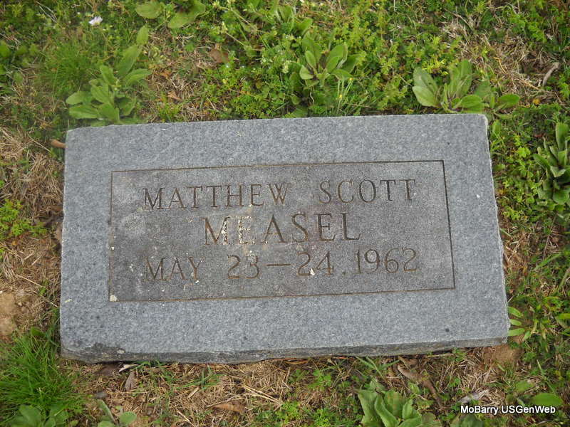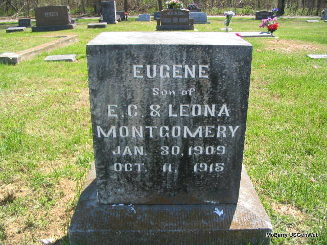 Inscription: "Son of E. C. & Leona Montgomery" - Research Note: His death certificate, Barry County, MO, reads that he was age 7 years, 5 months, 11 days, which makes the birth year calculate at 1908. The undertaker was Neighbors, and he was buried Oct. 14, 1915. His father was given as E. C. Montgomery and his mother as Leona Reed, born AR. The informant was J. E. Reed, Exeter, MO. Stone listed born 1909, Certificate reads 1908. Also believe this is the unnamed Montgomery child who died at 7 years of age in newspaper. - Scrapbook bought at the estate sale of Vivian Roller by Ted W. Roller, unknown newspaper: LITTLE BOY DIES - A 7 year old son of Mr. and Mrs. Ernest Montgomery residing south of Exeter, died Sunday night of tonsillitis. The funeral services were conducted Monday, at Washburn Prairie Church House by Rev. E.W. Love of this city and interment was made there. A vacancy has been made in this family that will cause loneliness that time can only heal. The family will have the sympathy of all their acquaintances. | Note Online Obit Beverly Matthews (Deceased) Headstone Donna Cooper Photo Phyllis Long |
